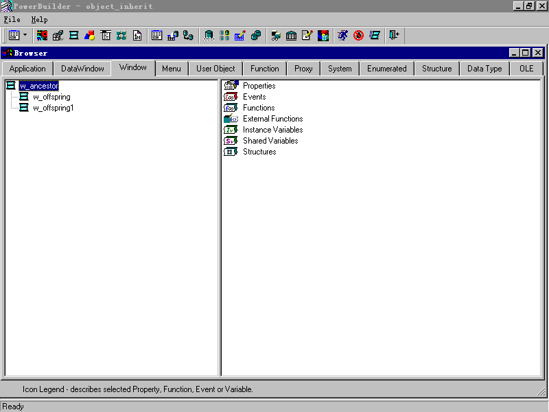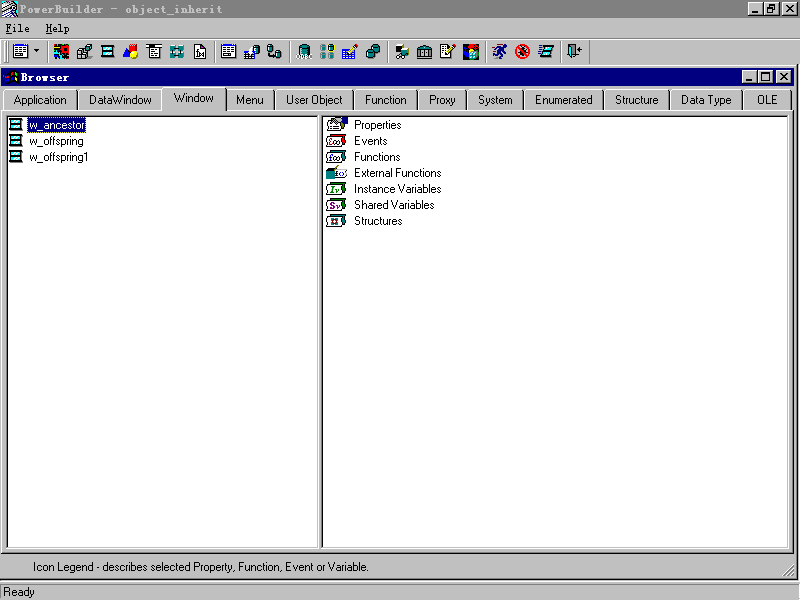在左边这一栏当中,显示了当前应用程序的所有窗口的名字。在左边这一栏中单击鼠标的右键,弹出菜单,在菜单当中选择 SHOW HIERARCHY 命令,显示窗口之间的派生层次关系。在W_ANCESTER 一项上面双击鼠标左键,我们就看到了刚才派生的后代窗口和祖先窗口之间的继承关系。如图10-5。