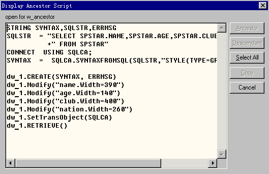 如果您想把已经修改的属性重设为祖先窗口中的内容,只要选择EDIT 菜单当中的RESET PROPERTIES重置属性命令就可以了。在数据窗口对象的下面我们就修改数据窗口的脚本,使之具有新的功能。