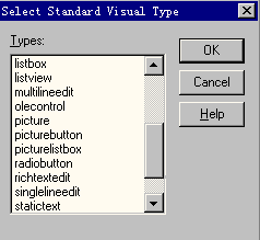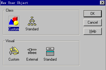 下面的VISUAL组框表示建立可视类型的用户对象,CUSTOM图标表示定制类型,定制的可视化用户对象是具有多个控件的对象,它们作为一个整体来发挥作用。