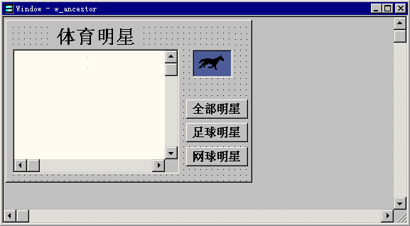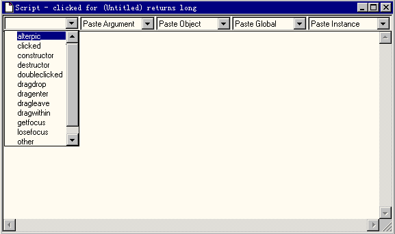 下面就用户对象画板的工作区。我们看到上面有一个图片控件。在它上面单击鼠标右键,弹出菜单,选择SCRIPT命令,开始编写脚本。编写用户对象的脚本要处理的一个重要问题就是解决用户对象和拥有它的窗口之间的通讯问题。一般的情况之下,我们有两种选择:使用函数,或者使用用户事件。