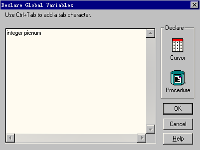 下面的工作当中,我们将会用到一个全局变量。如何定义一个全局变量呢?选择DECLARE菜单当中的DECLARE GLOBAL VARIABLES 命令,在POWER BUILDER弹出的全局变量定义对话框当中输入变量的定义,单击OK按钮,就完成了定义。如图11-7。