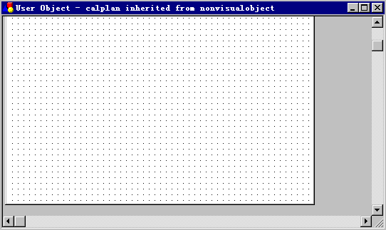 关于这两个组框的含义,在介绍可视化用户对象的时候已经进行了大致的说明。CLASS组框当中的STANDARD图标表示标准类型的类用户对象。POWER BUILDER本身带有一些不可视的用户对象,比方说前面曾经提到过的系统事务处理对象,通过继承这些系统对象生成的类用户对象就是标准类型的类用户对象。CUSTOM图标表示定制的类用户对象,顾名思义就是用户自己定义的类对象。我们选中这个图标,建立一个定制类用户对象。单击OK按钮,进入用户对象画板的工作区。如图11-12。