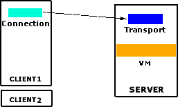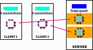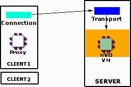 然后,代理对象调用SetConnect函数,为代理设置Connect对象。 Connect对象通过网络线传递给Transport对象一个链接消息。Transport正在用Listen函数侦听这个消息,于是在服务端中初始化了NVO对象。注意,我们不直接在服务端中初始化NVO对象,而是通过代理对象来初始化(图16-3)。