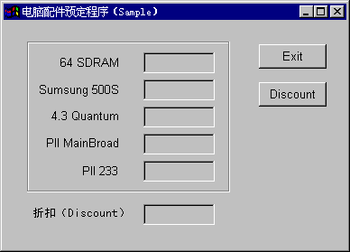 这是一个商品预定程序,所预定的是个人电脑配件。这是一些电脑常用配件名,旁边所列的配件的价格,这些价格来自电脑分销商的远程数据库。分销商将定期更改这些数据库中的价格表。最后的分销商给购买者折扣。与电脑配件不同的是,折扣值的是不公开的,分销商将给予不同的购买用户以不同的折扣,折扣的计算方法是秘密的,并且不断变化。