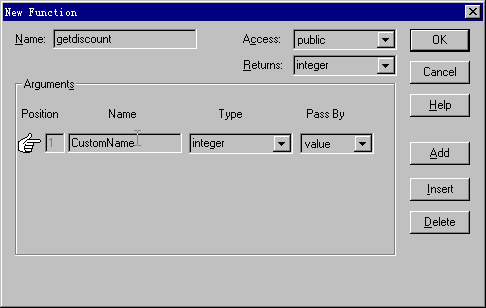 单击用户对象按钮,按NEW,然后选择Class框中的Custom按钮,系统出现一个用户对象窗口。我们可以注意到窗口的标题栏中有一句话为:Inherited from Nonvisual Object,它说明我们所创建的对象正是NVO。接着我们为NVO定义一个函数。打开Declare菜单中User Object Functions,按NEW按钮,这样就打开了函数定义窗口(图17-2)。这个函数名为GetDiscount,它需要有一个参数为Custom Name(用户名),类型为。字符串型。