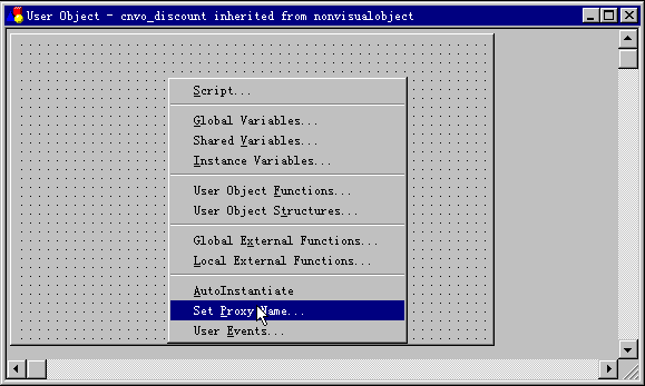 下面我们来生成非可视对象Cnvo_discount的代理对象。在用户对象画板上按右键,选中弹出式菜单的set proxy name,取名为Cpo_discount(图16-3)。在File菜单中选择Save,这样就生成了一个为名为Cpo_discount的代理对象。我们可以在Library画板检查一下,PowerBuilder是否真地生成了这个对象。注意,我们是在篇File菜单中选择Save后生成了这个对象的,如果不将之保存,那么,我们只是为这个NVO设置了一个属性,并未生成代理对象。现在,我们已有了两类对象,一个是非可视对象Cnvo_discount,它是折扣计算程序的真正实现的地方,一个完整的对象。另一个是名为Cpo_discount的代理对象,它定义了前者的接口。我们试用鼠标的右键,来编辑这个对象,可以发现,系统并不允许进行编辑,因为它并不是一真实的对象。