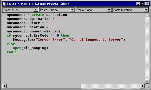 打开应用程序画板,选择它的Open事件。在其中只有一句打开窗口语句:Open Win_shoping。我们定义一个全程变量,输入:Connection myconnection。再从脚本编辑器中输入myconnect = create connection,为这个connection对象进行初始化。接着我们赋予它三个最基本的属性值:application、driver和location.。在不清楚之前,我们先给它们空值。至此为止,已经为connection对象初始完毕,我们还需用它来服务器建立联系。输入myconnect ConnectToServer。为了检查它是否真地找到了服务器,我们还需要输入一些脚本来验证它的返回值。如它的返回值不为空,则程序提示一些出错信息。如果等于0,则说明它已经正确链接到服务器,于是进一步打开主窗口win_shoping(图17-4)。