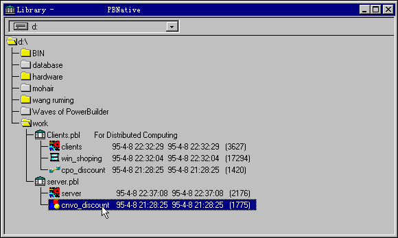 单击New按钮,系统弹出一个对话框,输入一个新的库名Server,再为Server生成一个新的应用名,名字也为Server,我们不需要系统自动生成的框架。接着,我们想把Clients库中的Cnvo_discount移至Server库中。打开Library画板,单击Clients点PBL,选择NVO对象Cnvo_discount,单击右键,选择Move。再查看Server库,可以发现在Server库中,原来在Clients中的Cnvo_discount已经移到了Server中(图17-5)。