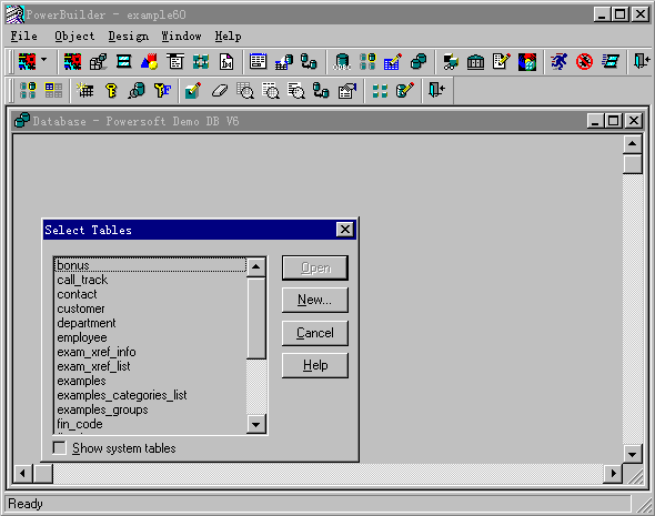 DATABASE画板按钮,利用它来创建新的数据库,单击后屏幕上弹出一个标题为SELECT TABLES的对话框(图2-2),让我们选择表,这些表是系统当前所连接的数据库中的表,因为我们现在是要创建新的数据库,所以单击对话框的CANCEL按钮关闭这个对话框,接着屏幕上显示的是一个完整的数据库画板窗口,窗口的标题显示的是系统当前所连接的数据库的名字。