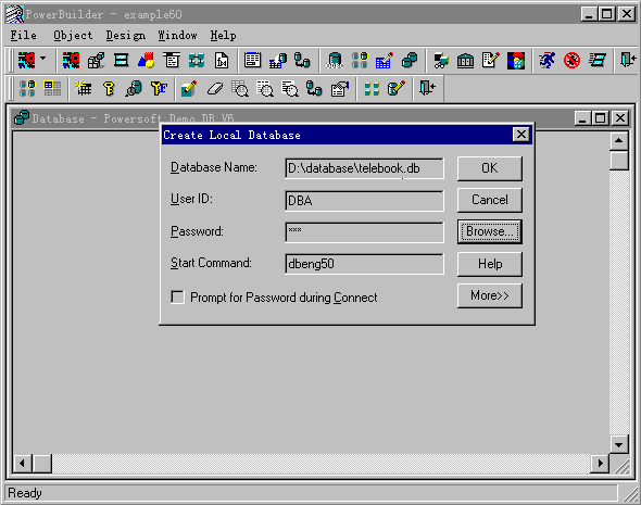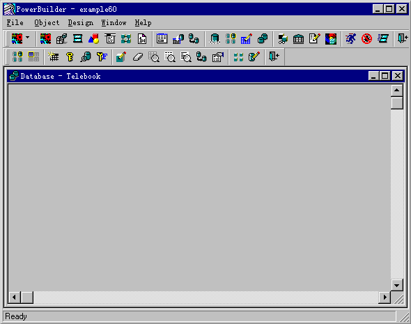 OK按钮,PowerBuilder的本地数据库管理系统就会自动生成SQL语句,在指定的目录D:\DATABASE下生成一个名为TELEBOOK的本地数据库,并以文件名TELEBOOK.DB保存在磁盘上。观察一下数据库窗口的标题,可以发现系统已经自动把新创建的TELEBOOK数据库作为系统当前所连接的数据库(图2-4)。