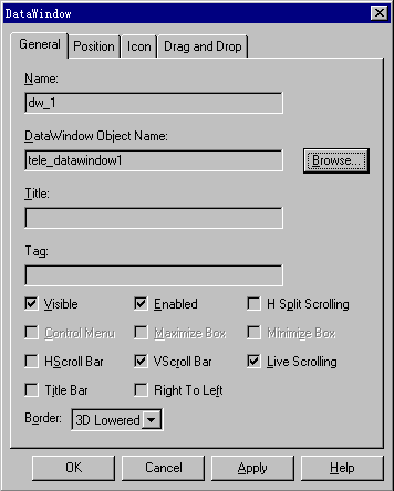 鼠标右键单击激活窗口中的第一个DATAWINDOW控件,在弹出的菜单中选择PROPERTIES菜单项,弹出DATAWINDOW对话框,系统已经自动为这个控件起名为DW-1,这里就用这个名字,单击BROWSE按钮开始为控件定义它所联结的数据窗口对象,在弹出的SELECT DATAWINDOW对话框中选择数据窗口为TELE-DATAWINDOW1,然后单击OK按钮,可以发现在DATAWINDOW对话框的DATAWINDOW OBJECT NAME一栏中出现了刚选中的数据窗口对象(图2-33)。