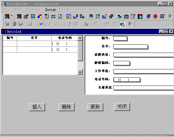 用类似的方法为第二个数据窗口控件联结刚才定义的数据窗口对象TELE-DATAWINDOW2,联结好之后把四个命令按钮控件上的文字分别改为“插入”,“删除”,“更新”和“关闭”,而它们的名字则分别修改为“CB-INSERT”,“CB-DELETE”,“CB-UPDATE”,“CB-COLSE”。