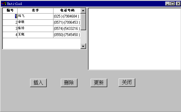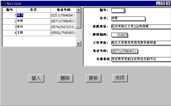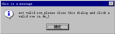 首先从FILE菜单中选择SAVE菜单项来保存我们上面所做的事情,然后关闭所有的窗口,从POWERBAR工具条中单击RUN按钮,系统开始运行我们的应用程序,先弹出的是“个人通讯录管理系统”的登录窗口(图2-37),编辑框是用来输入你的口令,只有口令正确后才可以进入数据操作窗口来浏览和修改你的通讯录中的数据。如果输入一个错误的口令“ERROR”,然后单击OK按钮,可以发现系统没有反应,只是把输入焦点重新切换到编辑框让你重新输入口令,输入正确的口令“MYPASSWORD”后回车,系统关闭登录窗口进入数据操作窗口(图2-38),左边的数据窗口控件中显示的就是通讯录数据库中的所有记录的主要字段的值,单击其中的某个记录,这个记录的详细信息就会显示在右边的数据窗口控件中(图2-39),如果我们单击左边数据窗口上的非记录区域,比如标题栏,可以发现系统弹出一个对话框,其中的内容告诉我们刚才单击的不是一条有效的记录行,这个对话框正是我们自己设计的对话框(图2-40)。单击“确定”按钮关闭消息框,接下来我们插入一条记录,单击“插入”按钮,程序在右边的数据窗口中显示出一条新的记录用来输入记录数据,我们在新记录的各项中依次输入“5,薛明,江苏南京,210001,南京大学物理系,0255544678,目前担任系主任”,输好后单击“更新”按钮,新记录就本插入到数据库中,可以发现在左边的数据窗口中也多了一条刚输入的新记录。在左边数据窗口中鼠标单击入的新记录,然后单击“删除”按钮,这条记录就从右边的数据窗口中删除了,但此时的记录并没有真正从数据库中删除掉,再单击“更新”按钮,这条记录就真正从数据库中删除了,可以发现这时左边的数据窗口中也少了这条记录。对于数据的操作就演示到这,单击“关闭”按钮,应用程序就被终止,系统又回到了POWERBUILER的开发环境下。