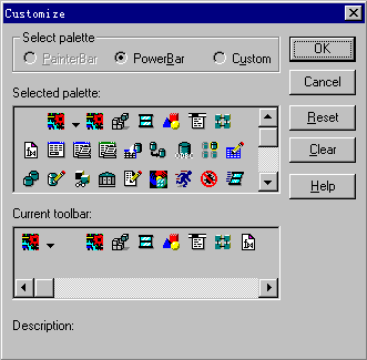 在弹出的菜单中有一个名为CUSTOMIZE的菜单项,选中它,系统弹出一个对话框,用来往当前的工具条中增加或者减少按钮(图3-2),对话框中的第一个单选按钮组合框中POWERBAR按钮被选中,表示当前是对POWERBAR类型的工具条进行定制。注意PAINTERBAR的单选按钮,代表另一种类型的工具条,主窗口左边的工具条就是一个PAINTERBAR类型的工具条。下面介绍定制POWERBAR工具条的有关操作: