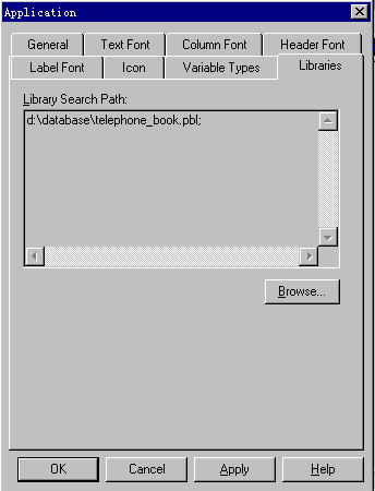 接下来为应用程序指定对象搜索路径,我们已经知道PowerBuilder应用程序中包含许多的对象,这些对象都要放在对象库中,PowerBuilder并不要求把所有的对象放在一个对象库中,而且一个应用程序可以同时引用几个对象库中的对象,这样当使用一个对象的时候就存在如何在对象库中搜索对象的问题。单击APPLICATION对话框中的LIBRARIES标签,可以在这个名为LIBRARY SEARCH PATH的编辑框中输入搜索对象库的完整路径,也可以单击BROWSE按钮,然后在系统中选中一个已存在的对象库,确定后系统就把它的路径自动放到编辑框中。应用程序在使用对象的时候系统就会按照编辑框中设置的路径依次在对象库中搜索被使用的对象,如果搜索失败将会出现系统错误。
