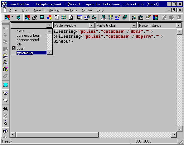 最后介绍一下应用对象的事件。确定应用对象处于打开状态,单击PAINTERBAR工具条上的SCRIPT按钮,在SCRIPT窗口中的第一个下拉列表框中显示的就是应用级事件(图3-6)。下面介绍几个主要的也是最常用的事件,OPEN事件是在应用程序启动后发生,在这个事件的脚本中主要做程序的初始工作,如给全局变量赋值,打开窗口等,CLOSE事件是在应用程序将要关闭的时候发生,这个事件的脚本是用来处理程序关闭前的善后工作,比如和后台数据库断开连接等。如果程序中调用了IDLE函数,那么应用程序运行时用户在一定的时间里没有使用鼠标和键盘就会触发IDLE事件。IDLE事件的脚本用来处理程序长时间没有输入事件的情况,比如可以在脚本中调用屏幕保护程序。SYSTEMERROR事件发生在程序运行出现严重错误的时候,这时不加以处理的话系统会弹出警告对话框指出问题的所在,我们在这个事件中编写脚本的主要目的是防止因为程序运行错误而导致应用程序,甚至整个系统的瘫痪。