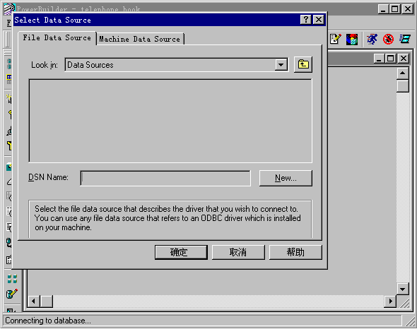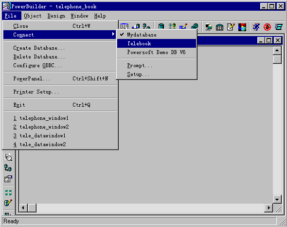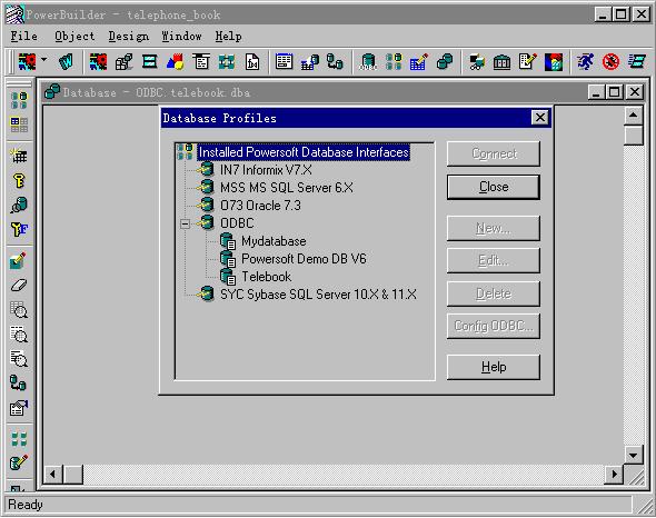 从FILE菜单中选中CONNECT菜单项,系统弹出一个子菜单(图4-1),其中的菜单项被分成了两部分,上面部分中的菜单项代表了系统可以连接的数据库描述的名字,数据库描述是用来定义和存放与某个特定的数据库或者数据源相连时所需要的各种参数的,它将在程序进行数据库相连时被使用,为连接工作提供所需要的各种参数。加了选中标记的表示系统当前所连接的数据库来自这个数据库描述。如果我们单击其它的数据库描述,系统将会把这个描述中的数据库设置成当前数据库。CONNECT菜单的下面部分的两个菜单项是非常重要的,它们用于配置数据库的信息。选中PROMPT菜单项,系统弹出名为DBMS的对话框,让用户选择数据库管理系统,列表框中列出的是当前PowerBuilder支持的所有类型的数据库管理系统。这里选择ODBC类型,它最常用,也最具有通用性。选好后单击OK按钮,弹出一个对话框让我们选择数据源(图4-2),也就是数据库的名字,这里显示的数据库都是可以使用ODBC方式访问的数据库,也就是我们刚才选中的ODBC类型的数据库。选择我们以前创建的TELEBOOK数据库,然后单击OK按钮,系统就连接到被选中的数据库并打开SELECT TABLES对话框用来选择数据库中的表,从这里开始就可以对当前的数据库进行你需要的操作。关闭SELECT TABLES对话框,单击FILE菜单,然后选中CONNECT菜单项,可以发现这是它的子菜单中没有一个处于选中状态,也就是说没有一个数据库描述被选中,这是因为此时我们没有利用数据库描述来间接连接数据库,而是采用交互的方法直接选中了一个实际的数据库并打开它。