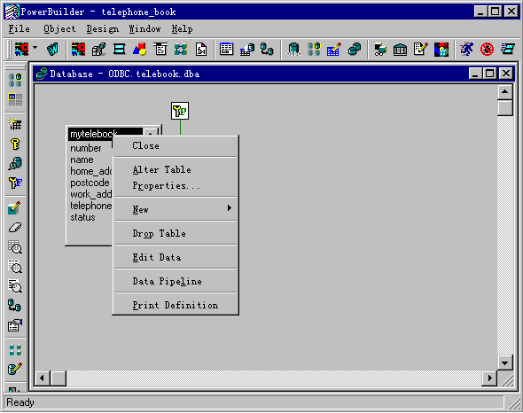 把先前创建的表MYTELEBOOK打开到DATABASE画板中,在表的标题上单击鼠标右键,系统弹出一个菜单(图4-5),菜单的第一项CLOSE是用来关闭这个表。菜单的第二项ALTER TABLE用来对表的定义作出一些修改,选中这个菜单项后系统会弹出ALTER TABLE窗口用来对表的一些属性作修改,在ALTER TABLE窗口中有一些属性,如字段的类型等是灰色显示的,这表示这些属性是不能修改的,否则会影响表中的已有数据和产生其它负面影响。所以系统不允许修改。弹出的菜单的第三项是PROPERTIES菜单项,用来设置表的总体属性。选中这个菜单项,从弹出的对话框的标签可以看出在这里可以定义表的主键,对表的注解,还有表中显示的数据的字体等。弹出菜单的第四项是NEW,它又有两个子菜单项,选中INDEX子菜单项,弹出CREATE INDEX对话框,在这里可以定义表的索引字段和索引的名字,定义索引的好处是可以加快从表中搜索数据的速度,NEW菜单的第二个子菜单项FOREIGN KEY 是用来定义表的外部码,所谓外部码就是当前表的一些字段的组合,这些字段的组合同时又是另一个表的主键。弹出的菜单的第五项DROP TABLE的作用是删除表,建议不要轻易删除一个表,因为删除后就不能恢复了。弹出的菜单的第六项EDIT DATA用来对表中的数据进行操作,例如往表中增加记录等。菜单的第七项是有关数据管道的内容,放在以后介绍。菜单的最后一项PRINT DEFINITION被选中后将在打印机上打印出当前表的定义,打印的格式类似表定义时的格式。