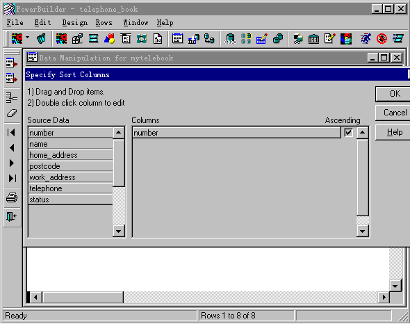 4-8我们可以为记录排序,单击ROWS菜单的SORT菜单项,就可以定义排序的字段,比如这里定义NUMBER字段为升序(图4-9),然后单击OK按钮,窗口中的记录就会按升序排列。另外也可以过滤出窗口中的一些记录,单击ROWS菜单的FILTER菜单项,在弹出的对话框中就可以定义过滤的条件,比如定义为“NUMBER>3”,然后单击OK,窗口中将只显示编号大于3的记录。