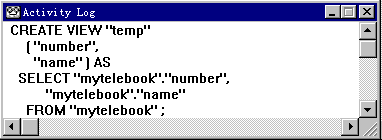 4-9最后介绍一下日志的概念,在DESIGN菜单中有一项是START/STOP LOG,它的作用是启动或关闭日志,启动日志后系统会把数据库管理系统生成的所有SQL语句显示在ACTIVITY LOG窗口中,这里不妨生成一个新的视图TEMP,然后观察ACTIVITY LOG窗口,其中的内容就是生成视图的SQL语句(图4-10)。我们可以把窗口中的SQL语句保存起来为以后使用。单击DESIGN菜单的CLEAR LOG菜单项,可以清除ACTIVITY LOG窗口,以便开始新的日志。