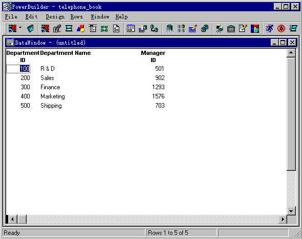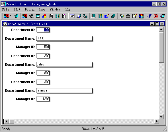 选中FREEFORM显示风格,然后单击OK按钮,弹出的QUICK SELECT对话框中选中DEPARTMENT表,单击ADD ALL按钮选中表的所有列,然后单击OK按钮关闭对话框。单击PAINTERBAR工具条上的PREVIEW按钮,DATAWINDOW画板上显示的数据就是FREEFORM风格的,可以看出FREEFORM风格的数据的特点是一个字段占一行,字段的值就显示在字段的标题后面。看起来很清楚,这种风格特别适合用来作为数据输入的用户界面(图5-1)。