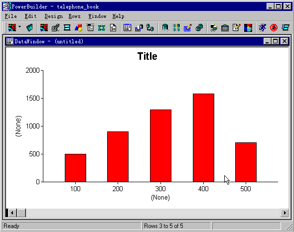 5-1再次从POWERBAR工具条上选择DATAWINDOW按钮,在SELECT DATAWINDOW对话框中选择NEW按钮,这次数据显示风格选择为GRAPH,然后在QUICK SELECT对话框中选中DEPARTMENT表的全部字段,确定后系统弹出GRAPH OBJECT对话框用来定义图表风格的数据窗口对象所特有的一些性质,对话框中比较重要的是CATEGORY栏,它用来选择将要生成的图表的横轴的含义,比如这里选中DEPT-ID字段作为横轴,表示横轴上的每一列代表某个特定PT-ID字段的值。与CATEGORY栏密切相关的是VALUE一栏的值,比如这里选中SUM(DEPT-HEAD-ID FOR GRAPH),这样表示在要创建的图表中对应横轴上每个特定的DEPT-ID字段的值,把在DEPATTMENT表中所有DEPT-ID字段的值等于这个特定值的记录的DEPT-HEAD-ID字段的值全加在一起,然后作为图表纵轴的值显示图表,设好这两项后单击OK按钮,DATAWINDOW画板中显示的就是GRAPH风格显示的数据的样式,要注意的是这里的图表并没有显示出真正的数据,只是一个示意图。要显示真正的数据可以单击PAINTERBAR工具条上的PREVIEW按钮,真实数据的图表就显示在数据窗口画板中(图5-2)。总之GRAPH风格显示的数据的特点是直观形象。同时也带有一定的统计功能,使用它可以为你的应用程序增色不少。