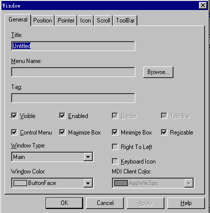 接着的若干个复选框分别用来设置窗口是否可见,有效,是否有控制菜单,最大、最小化按钮,是否可改变大小等等,其中灰色的复选框表示对这种类型的窗口是不可用的。