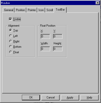 SCROLL标签用来用来设置窗口的滚动特性,在这里可以设定窗口是否具有滚动条,对话框上的四个编辑栏用来设置滚动条滚动的特性和幅度,也就是单击滚动条上的箭头或者其它地方的时候窗口每次滚动多大的距离。左边的两个编辑栏用来设置水平滚动条的特性,UNITS PER LINE的值为0表示单击滚动条上的箭头时滚动窗口宽度的百分之一。而COLUMNS PER PAGE值为0表示单击滚动条上的空白区域时每次滚动10列。一般情况下我们不对窗口的这些缺省值进行修改。TOOLBAR标签用来设置的工具条特性,这里可以设置工具条是否可见,工具条在窗口中的位置,要注意的是对于浮动方式的工具条,需要定义它的浮动特性,只有对有工具条的窗口才需要定义工具条的特性(图6-4)。