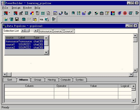 有些时候我们希望对已经建立的数据管道——比方说刚刚建立的PIPELINE1——进行一些修改工作。怎么办呢?单击POWER BAR 上的数据管道画板按钮,从列表框中选择PIPELINE 1 ,然后单击OK 按钮,就再次打开了这个数据管道。