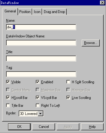 我们可以看到DATA WINDOWS OBJECT NAME 一项的内容为空,这说明DW_1这个数据窗口控件的所连接的数据窗口对象为空。关掉这个对话框。
